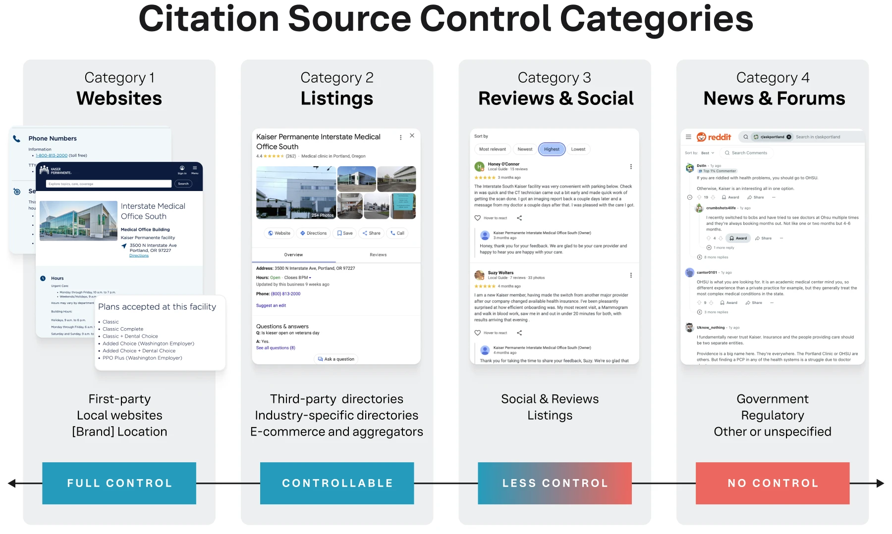 Foster conversations and user-generated content on social platforms that validate your brand’s key differentiators and market position. While forums like Reddit account for a small percentage of citations in location-based queries (~2%), they are still valuable for brand commentary and narrative shaping.