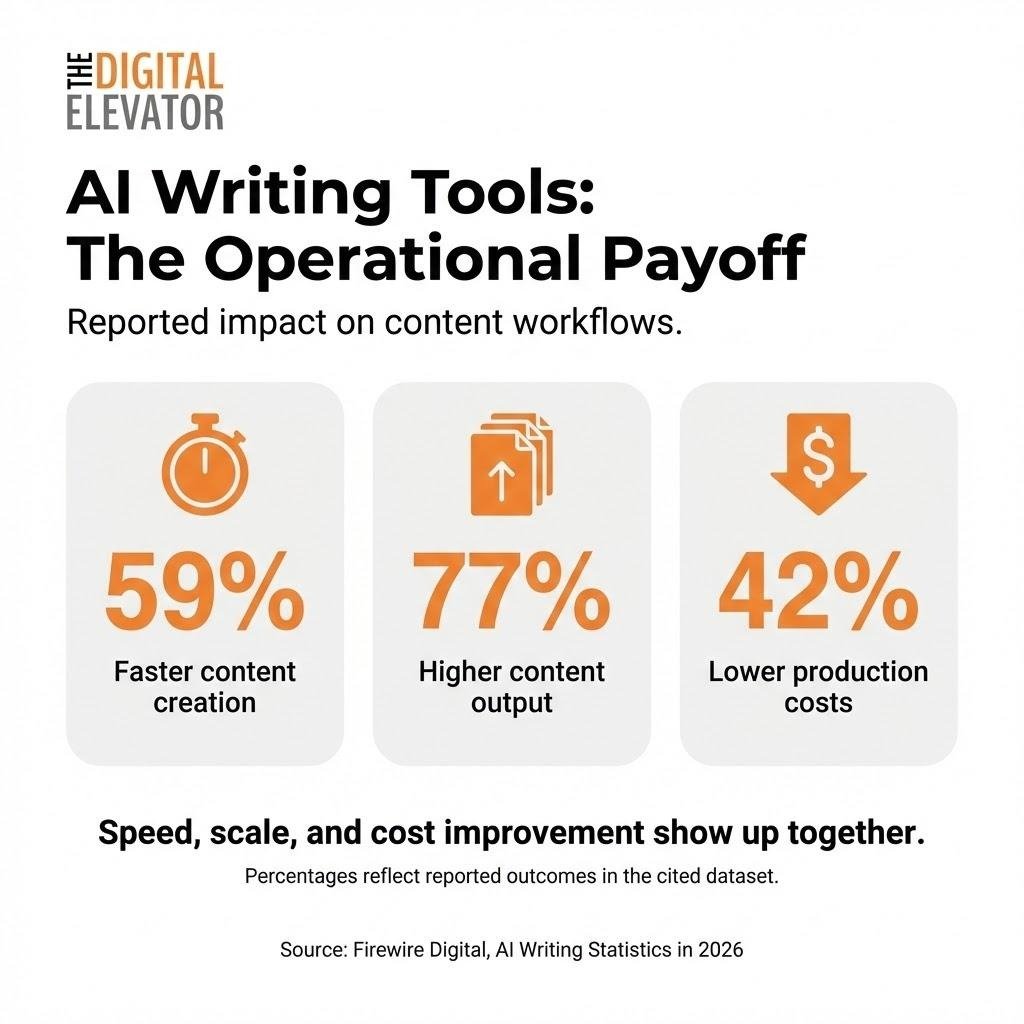 Organizations using AI writing tools report 59% faster content creation. Source: Firewire Digital.