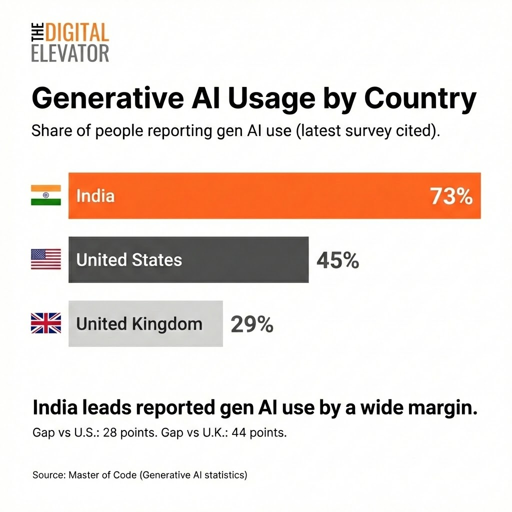 Reported generative AI usage varies sharply by country: India 73%, U.S. 45%, U.K. 29%. Source: Master of Code.