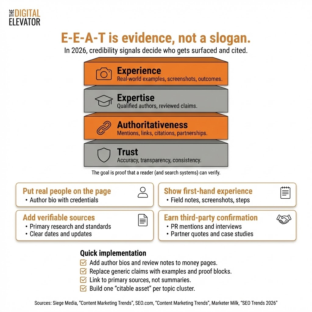 • SEO.com lists E-E-A-T emphasis as a core 2026 SEO trend, including showing “real people behind the site” through reviews and proof.