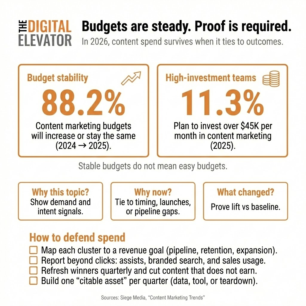 • Siege Media reports 88.2% said content marketing budgets would increase or stay the same between 2024 and 2025, and 11.3% planned to invest over $45,000 per month in 2025.